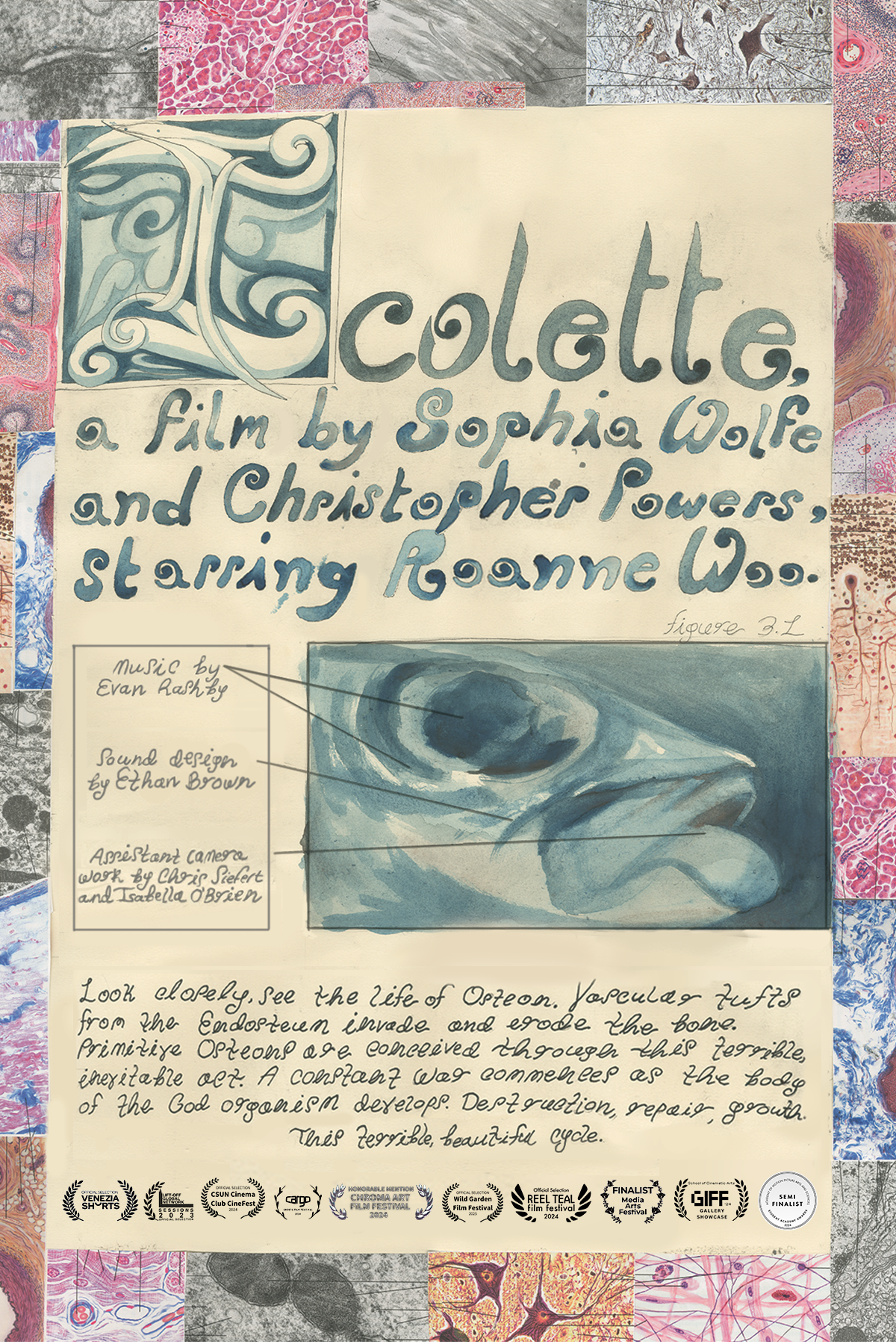 Icolette is a transcendental multimedia experimental film that mirrors natural systems and cycles. The film follows a young girl determined to collect the skin of a fish. In response, the fish fights for its life.